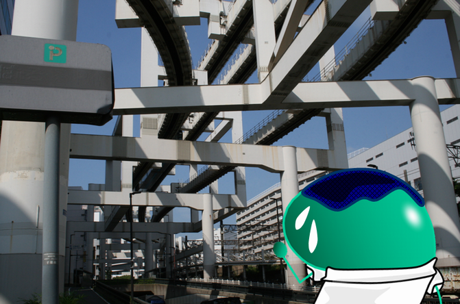 千葉市中心の交通の要となっている「千葉都市モノレール」だよ。営業距離が15.2Kmあって、これは懸垂型モノレールとしては世界最長の長さなんだ。ギネスにも認定されているんだって。千葉駅近くの分岐地点はレールを見上げているだけでもワクワクしてくるよ。 ※ この後、とぶ★たまちゃんはモノレールに見とれて自転車に轢かれました…。