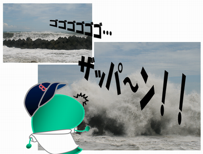 大会最終日に「日本平」と「久能山」と「登呂遺跡」を観光して帰ろうと思ったんだ。その途中の海岸線で台風の影響で大荒れの駿河湾を見たんだ。ゴゴゴゴゴ…って言う地響きがして、ザッパ〜ン!!と押し寄せる荒波は、もの凄い迫力だったよ。自然の驚異は本当に凄いね…。 |