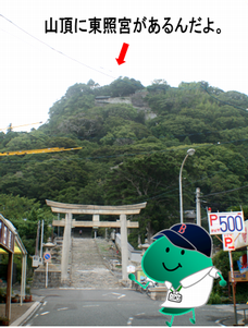 日本平の名称は日本武尊伝説に由来するんだ。日本平から久能山東照宮へはロープーウェイで結ばれていて、展望台からは駿河湾が一望できるんだ。天気が良いと富士山がドーンと見えるんだけど、今日は台風の影響で曇っていて、富士山は見えないね…残念。